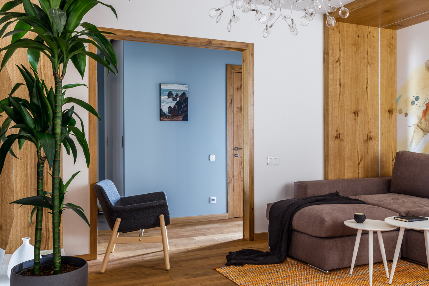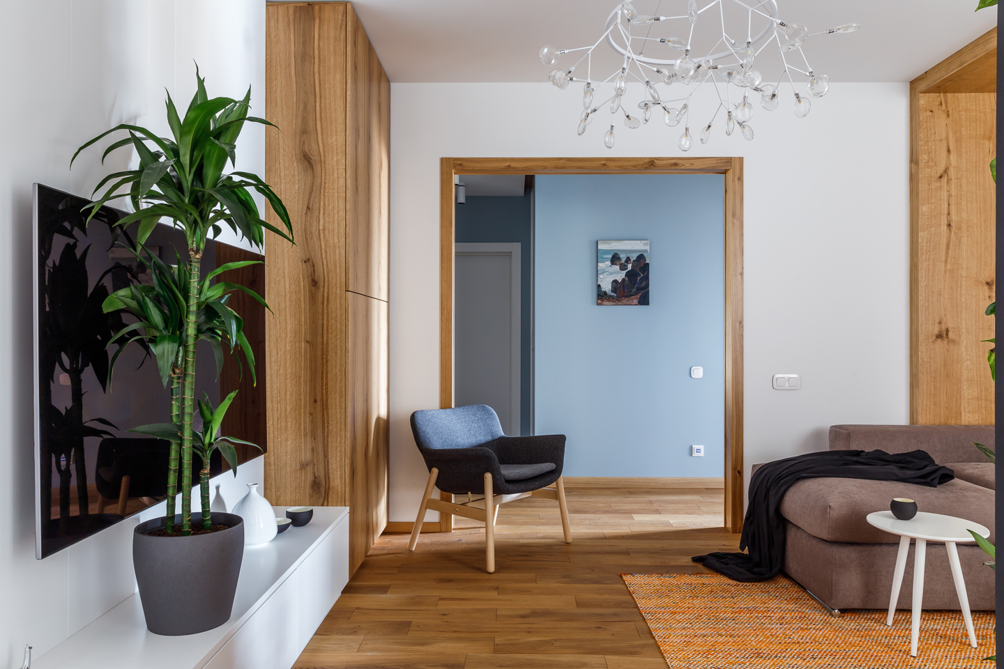 Минималистический интерьер квартиры выдержан в традициях скандинавского стиля. Отделка помещения выполнена шпонированными дубом Ретро и эмалированными панелями светлых оттенков.