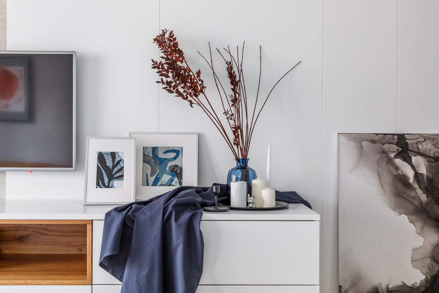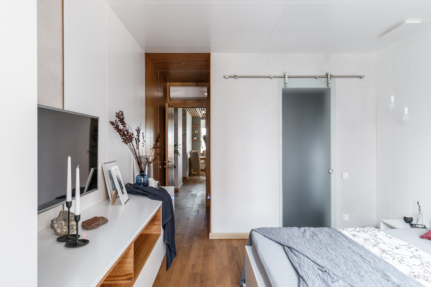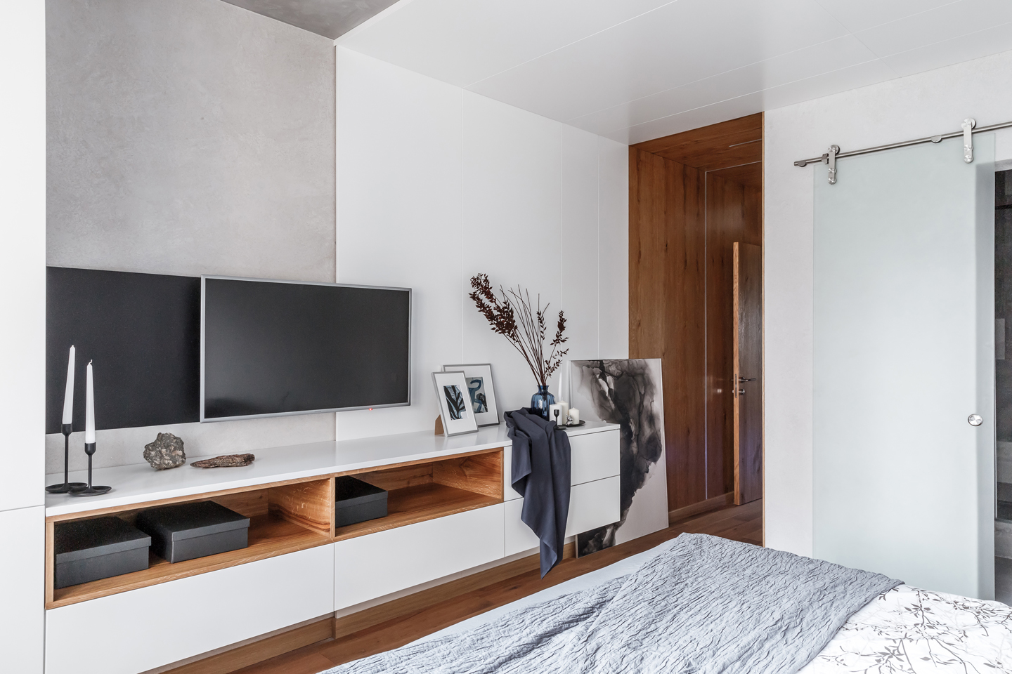 Минималистический интерьер квартиры выдержан в традициях скандинавского стиля. Отделка помещения выполнена шпонированными дубом Ретро и эмалированными панелями светлых оттенков.